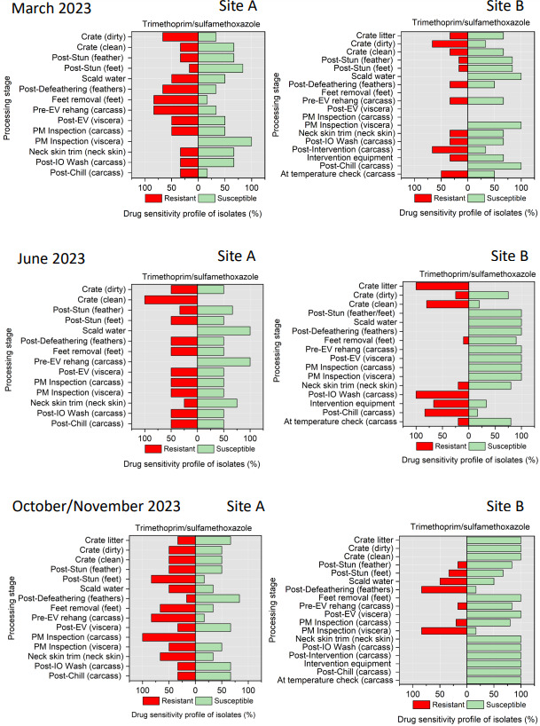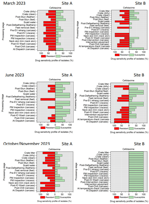 A Chinese study by Zhu et al. (2017) sampled caecal and carcass samples after evisceration and after cutting. Overall, 60.8% of Salmonella spp. isolates were MDR, and MDR isolates increased from 44.7% to 78.6% along the slaughtering line. Of these 94.6% (n =157) of beta-lactam-resistant isolates harboured at least one resistance gene of blaTEM or blaCTXM. However, this data was obtained from only two sampling points during processing (cecal contents and carcasses after evisceration, and chicken meat after cutting) in one processing plant. No details of the size or throughput of the plant were provided.