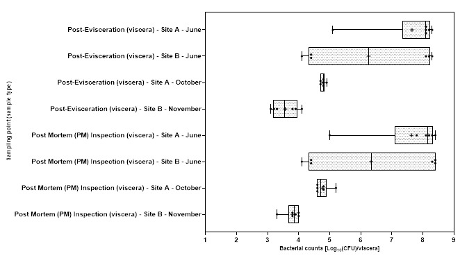 Vinueza-Burgos et al. (2019), a study in Ecuador, looked at presence of Salmonella spp. in farm and 3 stages in plant (caeca samples and skin samples before and after chilling). Salmonella Infantis isolates were isolated from all stages and had the highest isolation rate (94%, 66/70), and showed resistance to at least 6 antimicrobial agents. In contrast, Salmonella Mbandaka (1%, 1/70) and Salmonella Amsterdam (3%, 2/70) were only isolated from raw feed materials and overshoes (flock 1, farm C) respectively. One isolate from overshoes (flock 3, farm A) was auto-agglutinable and showed resistance to at least 6 antimicrobial agents. This study showed that some genotypes originated on farm and persisted through processing, whereas some were only found on carcasses, suggesting cross-contamination in plant played a role in the diversity of contamination. No details of the size or throughput of the processing plant was provided.