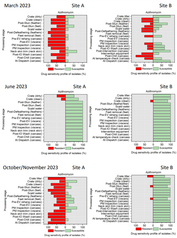 Sakaridis et al. (2019) determined the occurrence of Campylobacter spp. transmission during chicken processing in a small-scale plant (throughput of 6,000 birds per day) in Greece. While the pattern of AMR in isolates was identified, the occurrence of AMR in isolates was not mapped to transmission of AMR during specific processing stages.