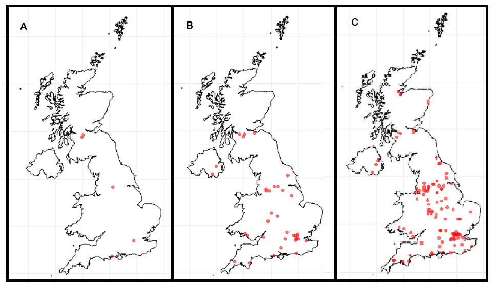3 maps of the UK and NI showing sampling locations of raw salmon samples. Map A shows L. monocytogenes detected from samples on the south coast, London, North England and Scotland. Map B shows other Listeria species detected with a spread accross the country. Map C shows E. coli detected with a spread accross the country.