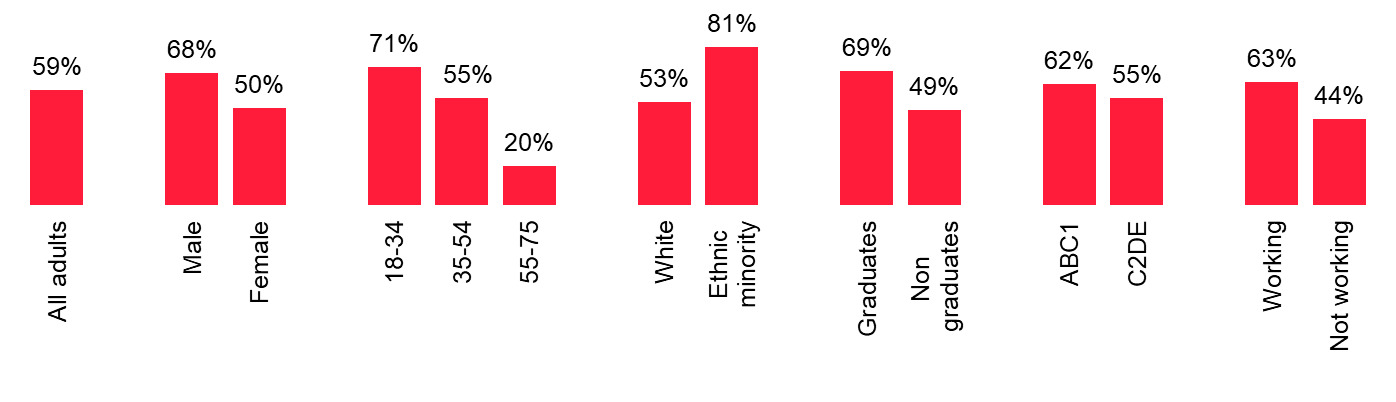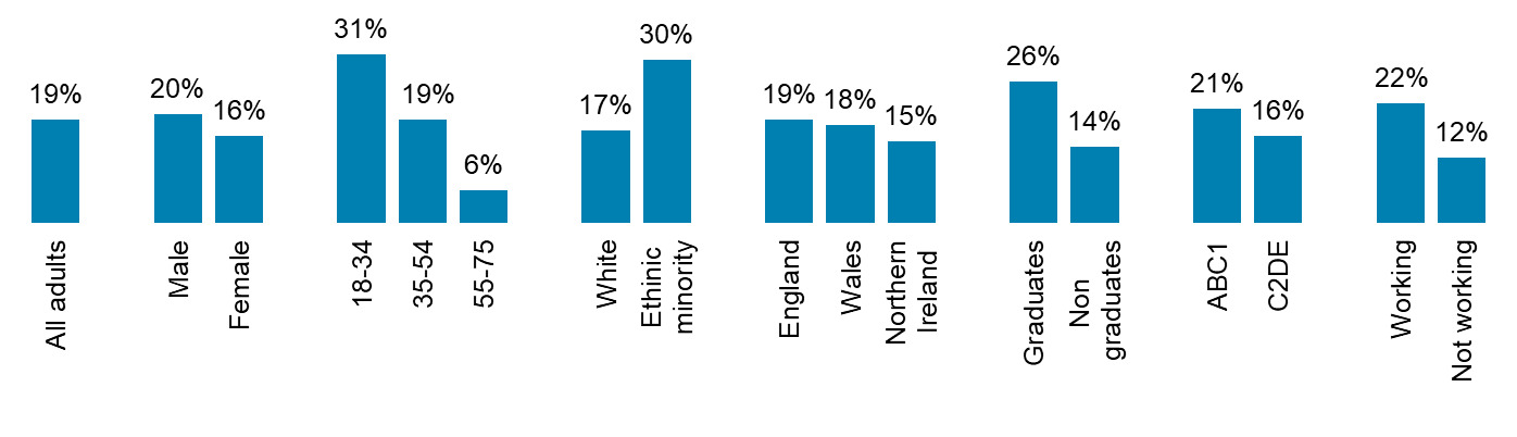 19% of adults aged 18-75 report having used products containing CBD in the past 12 months. Reported usage is much higher among 18-34 year olds (31%) compared to older adults (19% of 35-54s, 6% of 55-75s), as well as people from ethnic minority backgrounds (30% vs 17% from white ethnic groups). Usage is also slightly higher among men compared to women (20% vs 16%) and those in higher social class groups (ABC1) compared to lower social class groups (C2DE) (21% vs 16%).