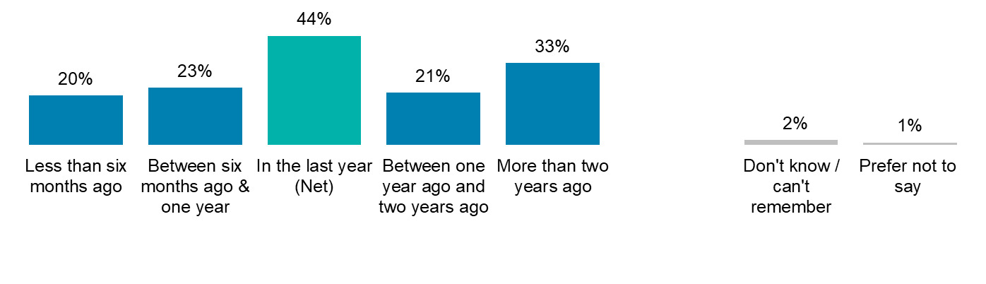As shown in Figure 2, just over two in five users (44%) say they first consumed CBD products in the past year, with a third reporting they did so more than two years ago