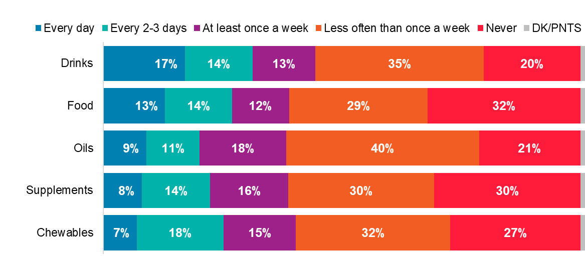 A shown in Figure 6, consumers use CBD in different ways with drinks and oils most popular overall, but oils used slightly less frequently.