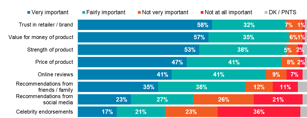 As shown in Figure 7, trust in retailer or brand, value for money, product strength and price are key factors when making decisions about buying CBD products.