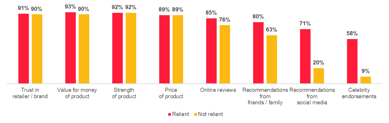 Trust in retailer / brand, value for money, product strength (all 91% very / fairly important) and price (88%) are the most important factors for users when making decisions about buying CBD products. People who feel reliant on CBD are significantly more likely than average to say social media recommendations (71% vs 51% overall) and celebrity endorsements (58% vs 38% overall) are important to them.