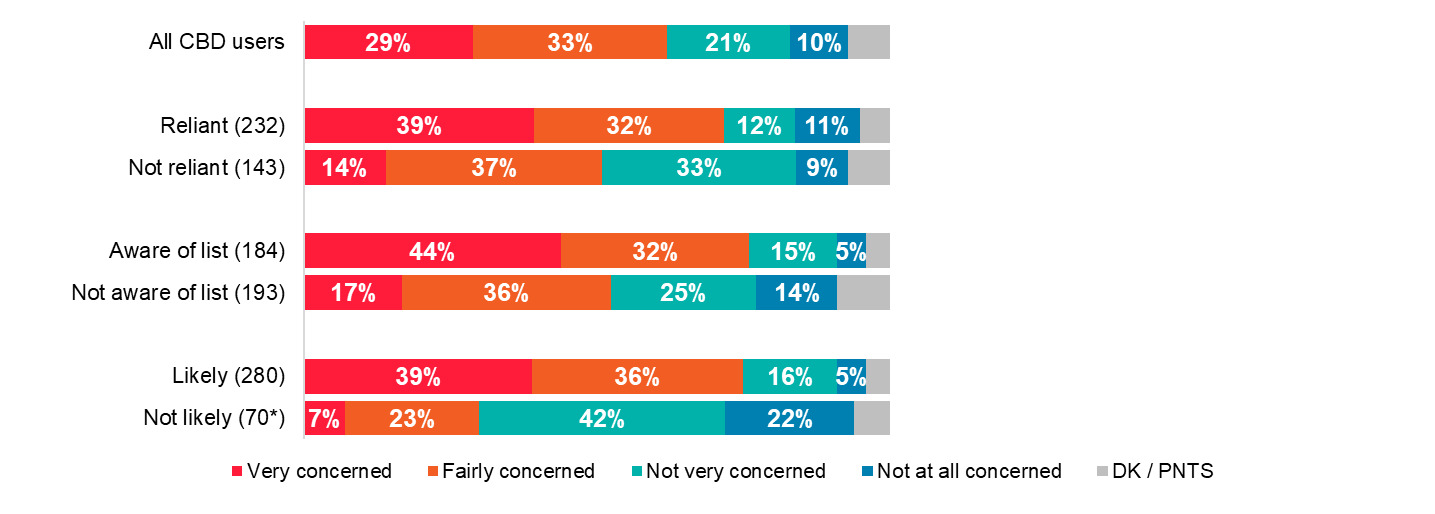 As shown in Figure 11, around two thirds of CBD users (63%) are concerned about consuming unauthorised CBD products – concern is higher among users who feel reliant (72%).