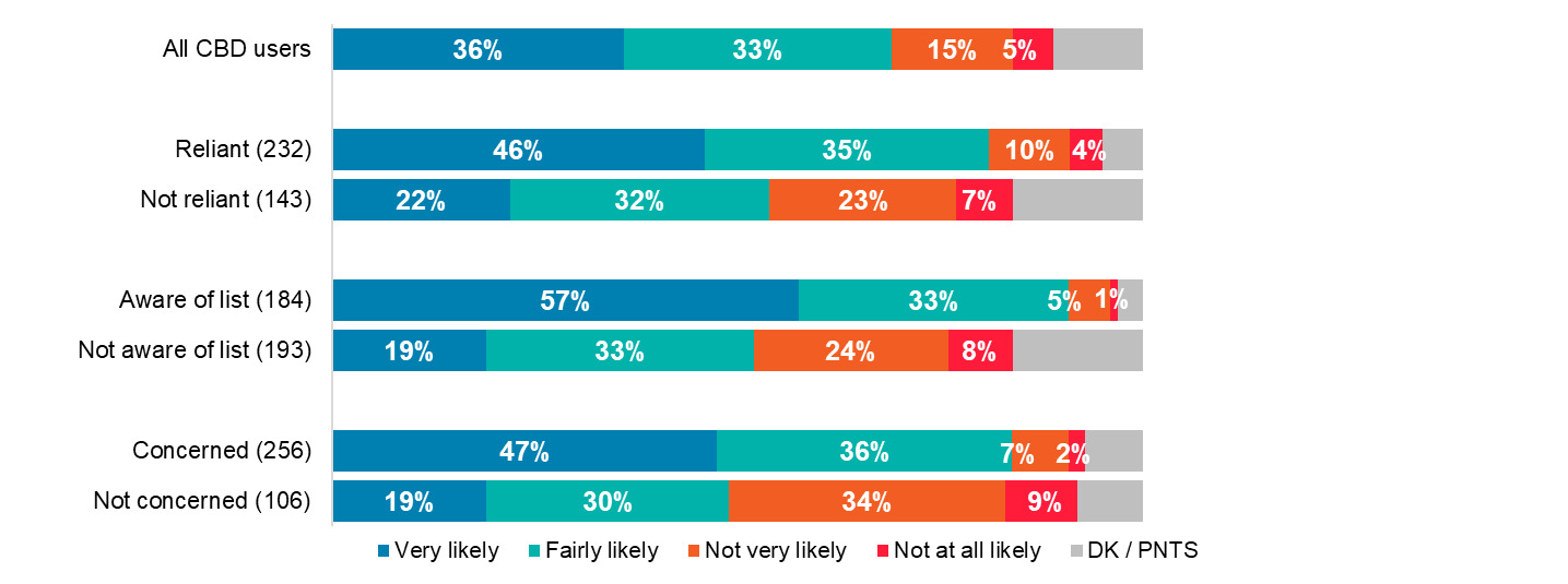 Twice as many users who feel reliant say they would seek an alternative/substitute (79%) compared with those who do not feel reliant (37%). In contrast, users who are not reliant are more likely to say they would stop using CBD products (44%) – or that they don’t know / prefer not to say what action they would take (17%).