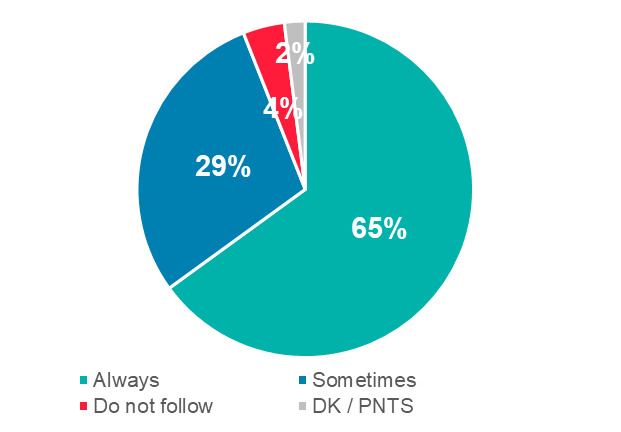 Of those who are aware, two thirds (65%) say they always follow this limit, and three in ten (29%) that they sometimes follow the limit (Figure 14).
