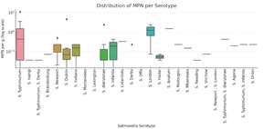 Salmonella was detected in 20.8% of RPF samples at an average level of 1.0 MPN/g and, included 24 different serovars. Salmonella was detected in at least one sample from 28 of the brands tested. MDR Salmonella isolates were detected in 8.9% of samples and one Salmonella Infantis was ESBL-producing.
