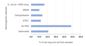 The study has assessed the occurrence of such bacterial hazards from raw dog and cat food on retail sale in the UK. The presence of Salmonella spp., Campylobacter spp., Shiga-toxin producing E. coli (STEC), methicillin-resistant Staphylococcus aureus (MRSA) and E. coli including those with extended-spectrum beta lactamase (ESBL) and/or AmpC-phenotypes or with resistance to carbapenems and colistin was investigated. Recognised standard methods were used and epidemiological cut-off values (ECOFFs) were used to assign phenotypic resistance to antimicrobials.
