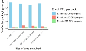 Salmonella and Campylobacter were detected in one sample each of 189 outer packaging samples. Two outer packaging samples had > 5000 CFU of E. coli per sample. An AmpC-producing E. coli was detected in one of 88 outer packaging samples tested for ESBL-/AmpC-producing E. coli, but E. coli with resistance to colistin or carbapenems were not detected in any of the outer packaging samples.