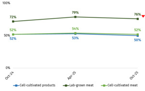 In October 2025, respondents remained more familiar with the term ‘lab-grown meat’ (76%) compared to ‘cell-cultivated meat’ (52%) and ‘cell-cultivated products’ (50%), as shown in Figure 10. Awareness of the term ‘lab-grown meat’ dropped slightly from 79% in April 2025 to 76% in October 2025.