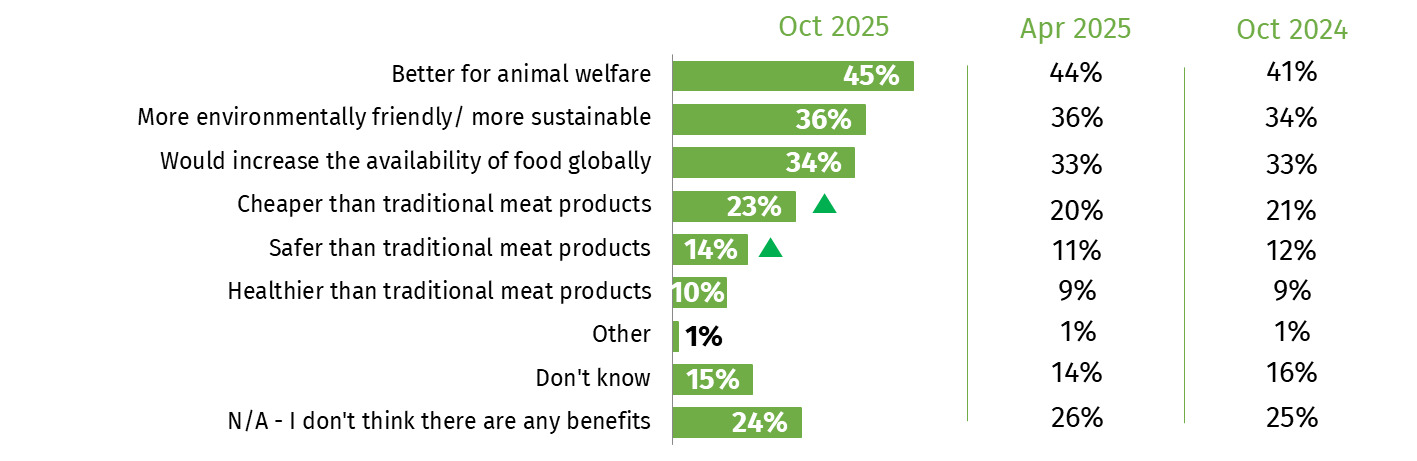 Figure 14 shows animal welfare (45%) and sustainability (36%) remained the most common perceived benefits of cell-cultivated meat in October 2025, while Figure 15 shows common concerns remained safety (53%) and a perception of cell-cultivated meat being ‘unnatural’ (49%).