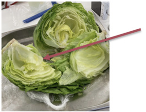 Samples were processed by cutting a 40±5g cross-sectional lettuce wedge (figure 2) running the length of the lettuce and incorporating all layers (external, middle and internal leaves and base) on a sterile surface with an autoclaved knife, and preparing a 10-1 homogenate in Buffered Peptone Water (BPW; prepared in-house), according to ISO 6887-1:2017 (International Organization for Standardization (ISO), 2017). A subsection of samples (Terajima et al., 2014) were additionally processed using a “rinse” methodology for comparison. To do this, the remaining sample after cutting two cross-sectional lettuce wedges as indicated above (minimum portion of 100 g) was rinsed with 100 mL of BPW and massaged manually for 2 minutes.