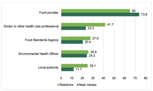 This also includes the 15% of adults (11% of reactions and 21% of near misses) and 9% of parents (12% of reactions and 19% of near misses) who reported receiving the wrong order or being provided with the wrong meal. Significantly more adults reported that their near miss was caused by this reason than reactions (21% of near misses compared to 11% of reactions).